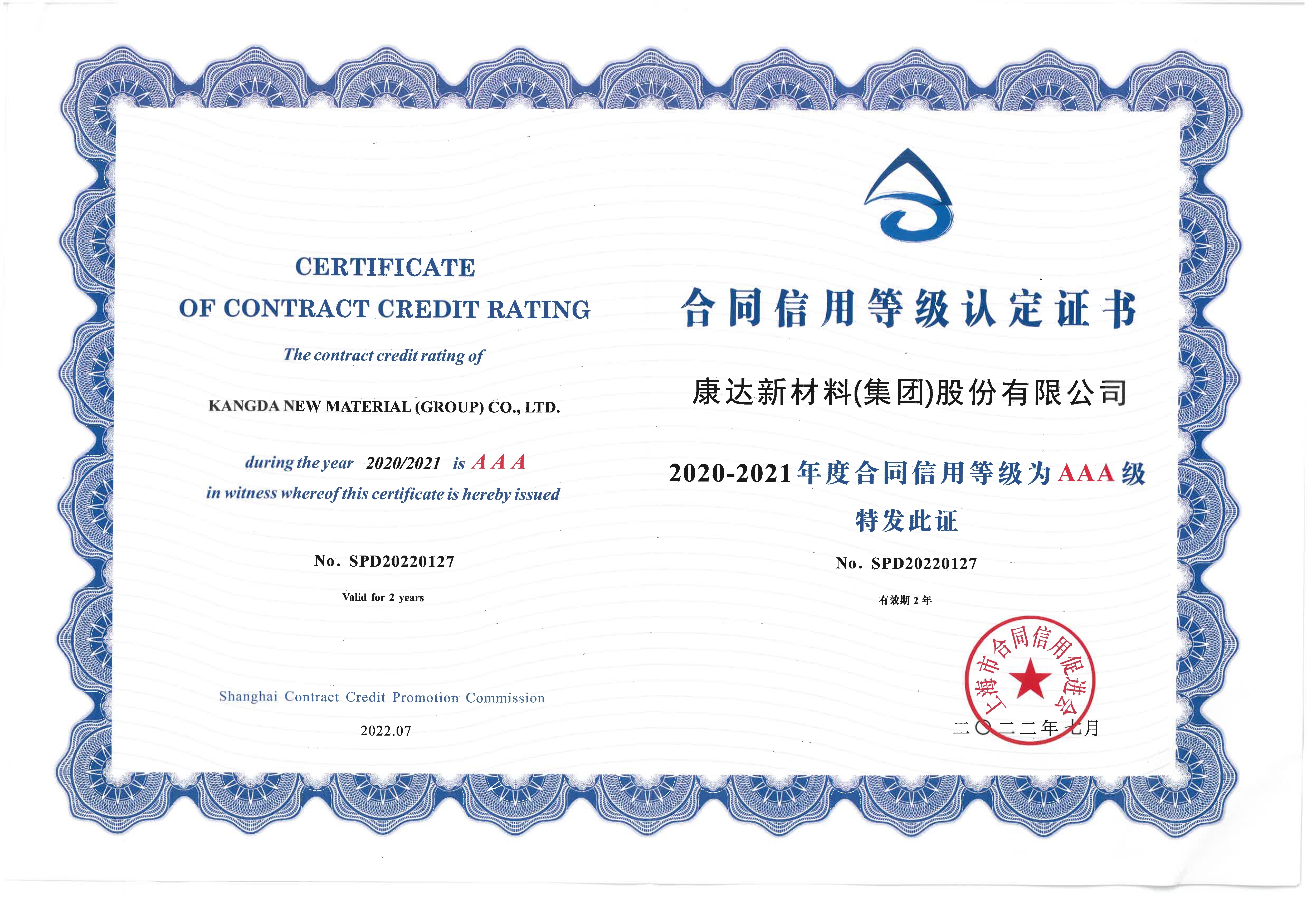 荣耀体育官方站网页版料(集团)股份有限公司榜上有名,再次荣获“上海市2020-2021年度守合同重信用企业”称号,并荣获AAA级合同信用等级认定